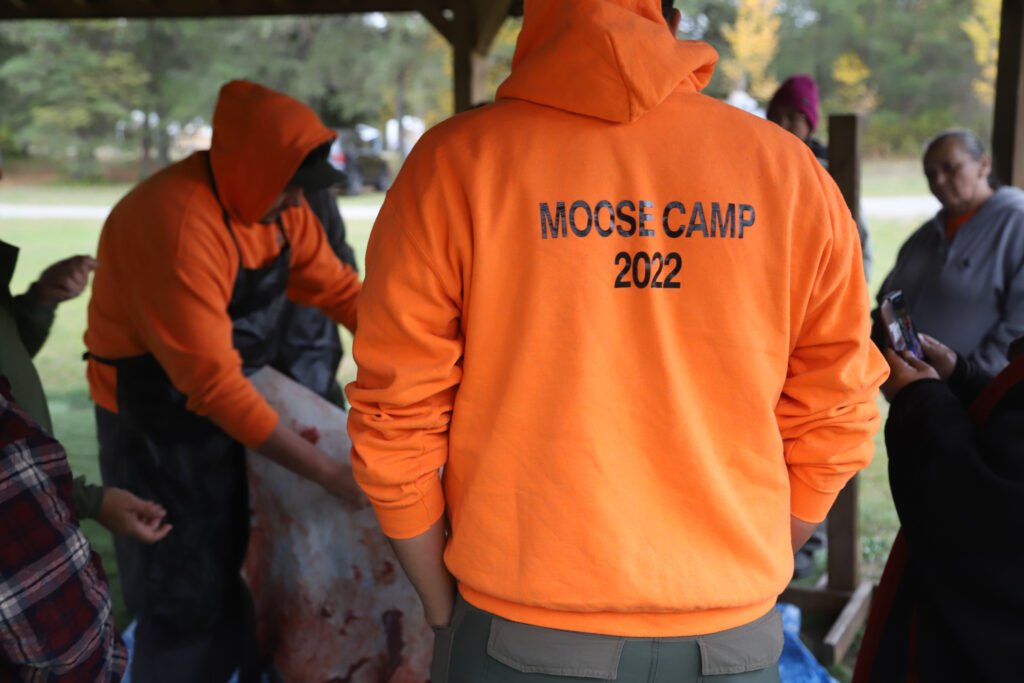 During the 2024 Moose Camp at Netmizaaggamig Nishnaabeg (Pic Mobert), community members gathered in festive spirits to participate in traditional activities. This moment was captured showing participants in bright orange hoodies during the event.