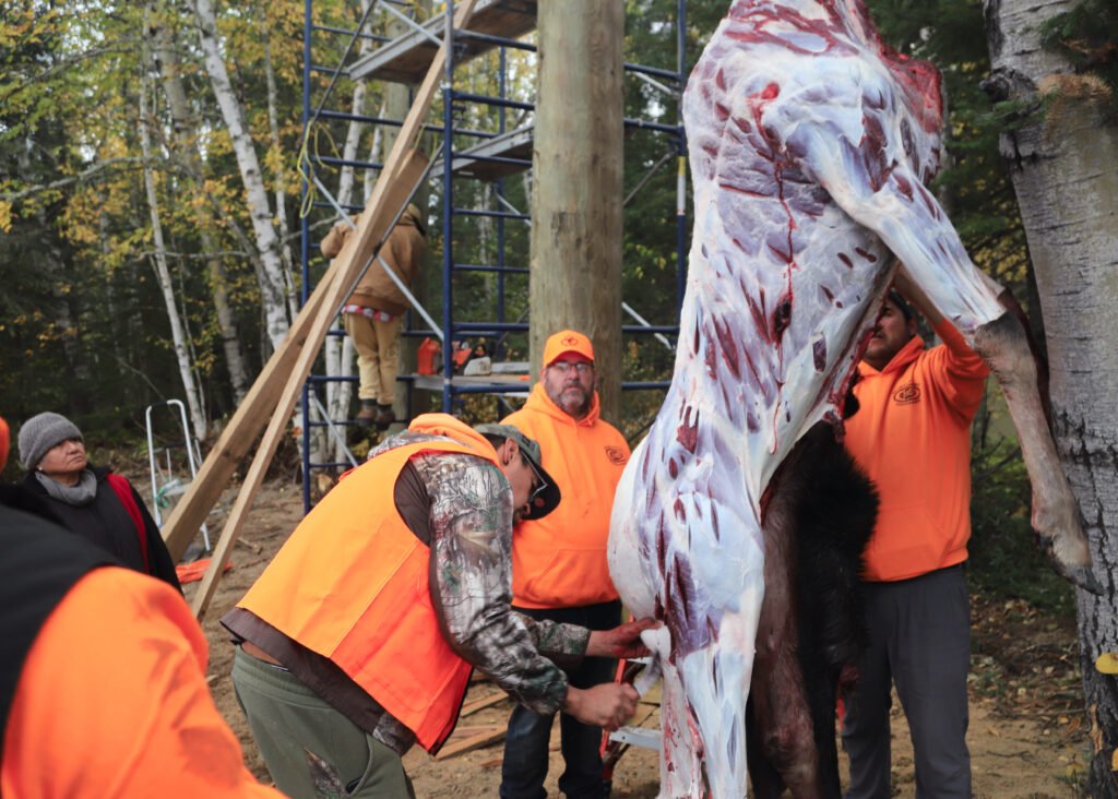 At Netmizaaggamig Nishnaabeg (Pic Mobert), community members wearing orange safety vests work together to process a moose that was harvested during the 2024 Moose Camp. This traditional practice demonstrates the community’s connection to their food systems and cultural traditions.